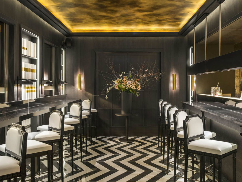 Smoky, black walls encasing the bar on the ground floor, for example, are punctuated with shelves housing bands of books jacketed with white and gold covers. A black-and-white marble floor in a chevron pattern offers a bit of an optical illusion.